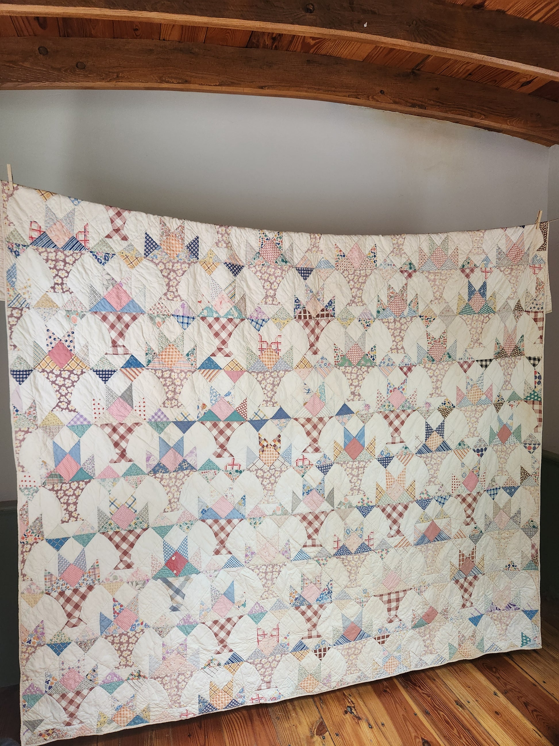 A darling, handmade vintage quilt made in the 1930s/40s in a Cake Stand pattern. It is full of dress prints and/or feed sack cloth in charming combinations of print and color. This quilt is hand stitched, both quilting and piecing.