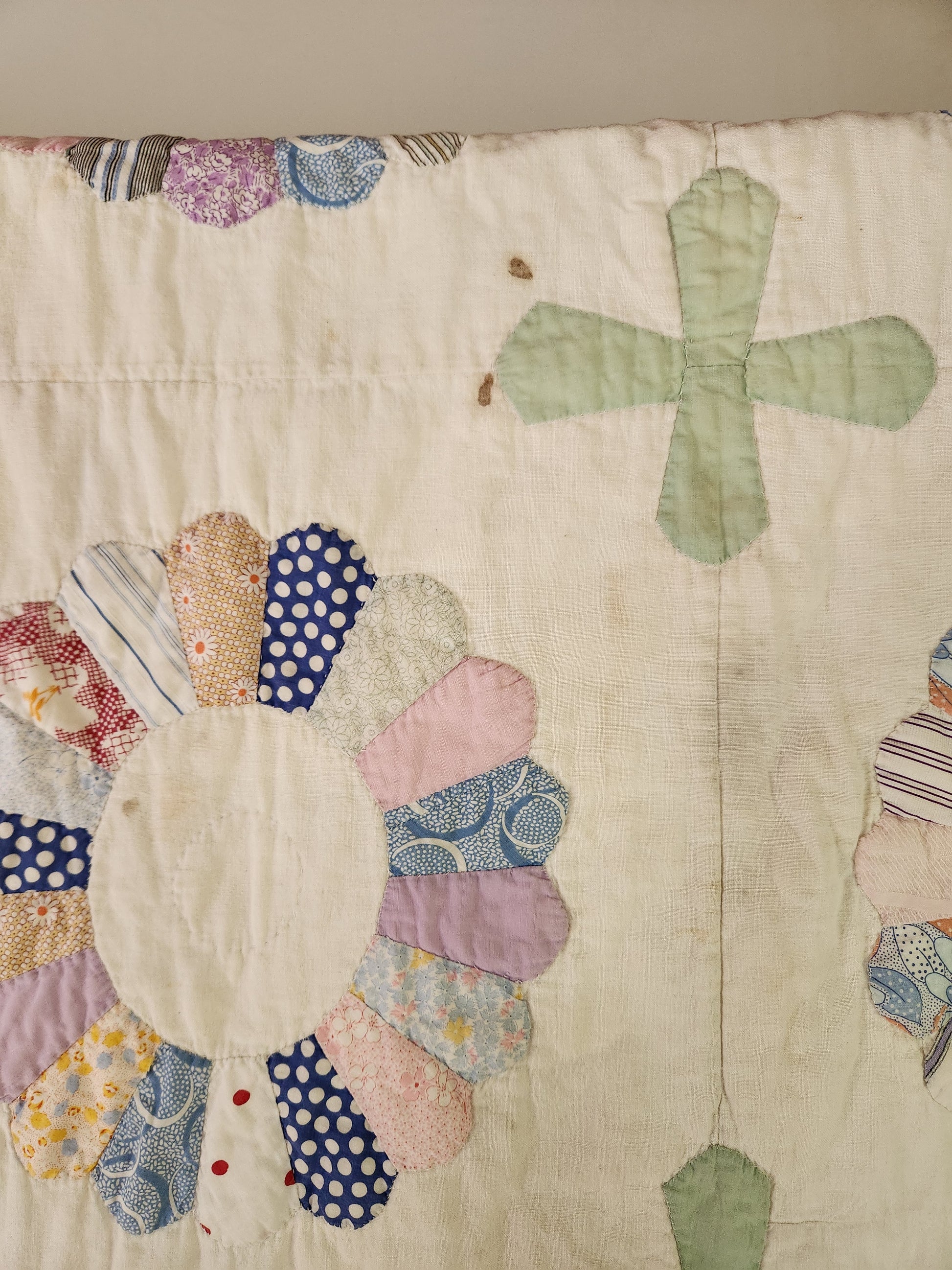 Condition: Good. Freshly washed, some residual stains remain. One green fabric is lost to fray on one plate. There is some slight batting shift in places from washing. Overall, soft and sound.