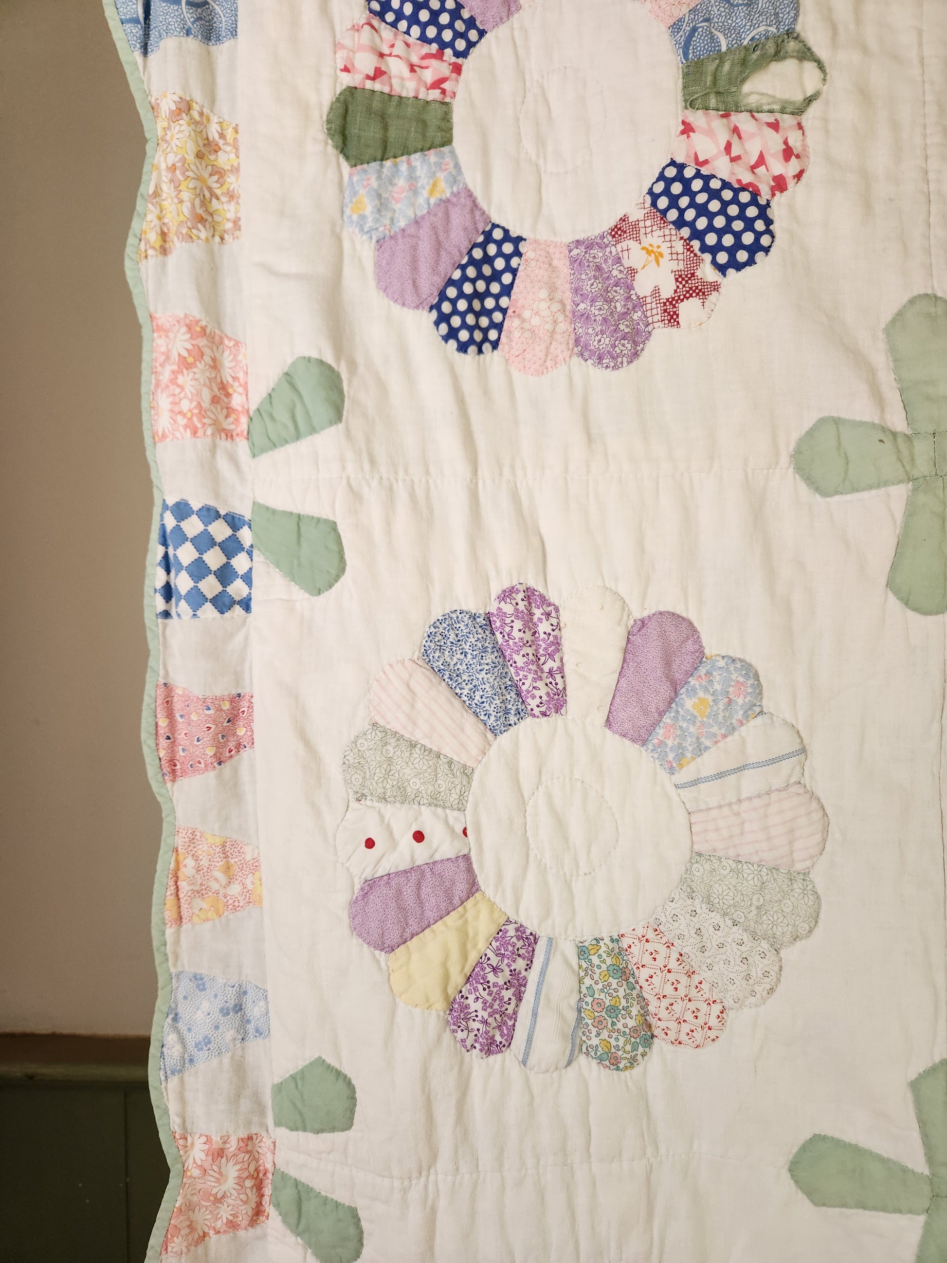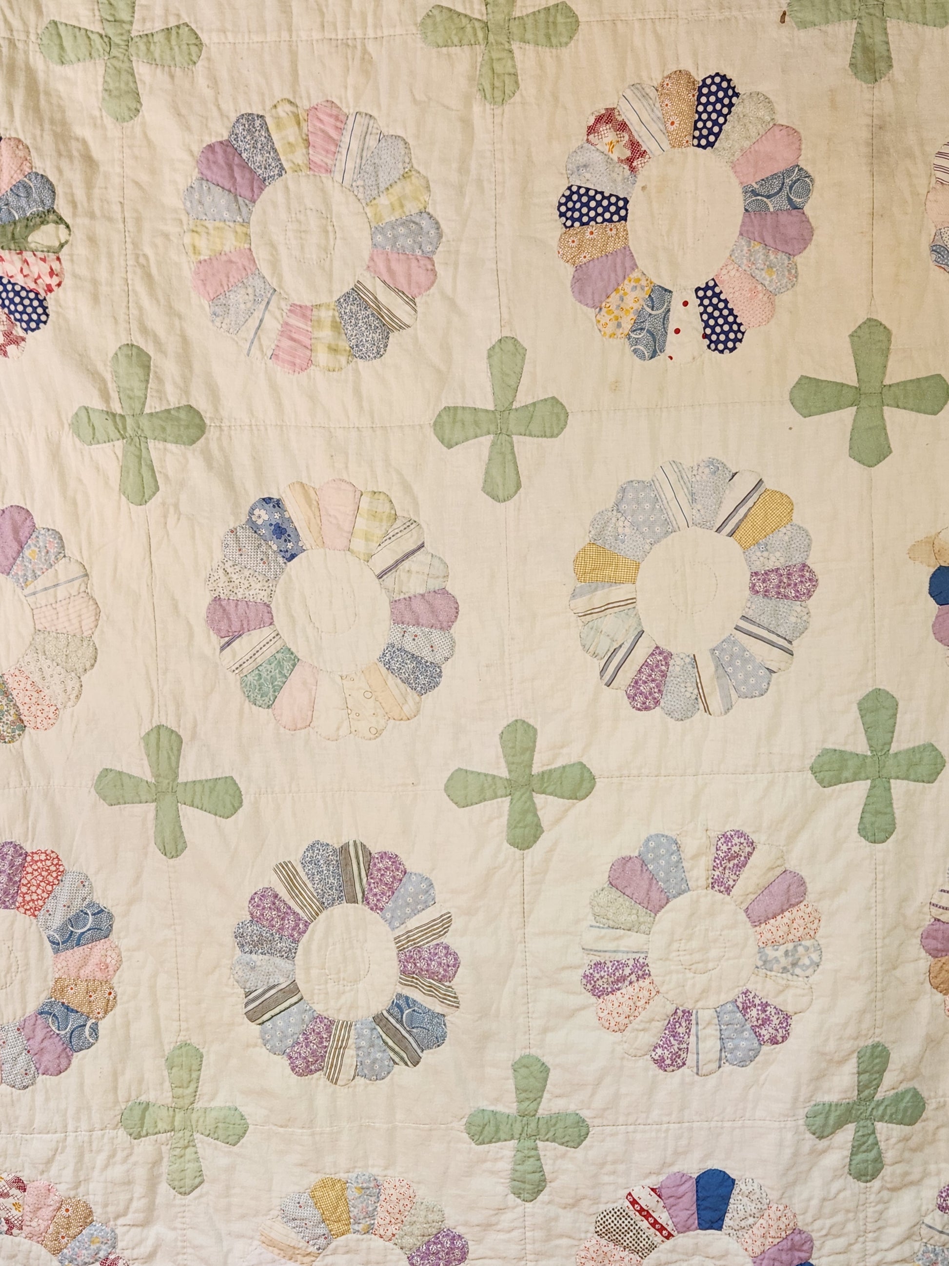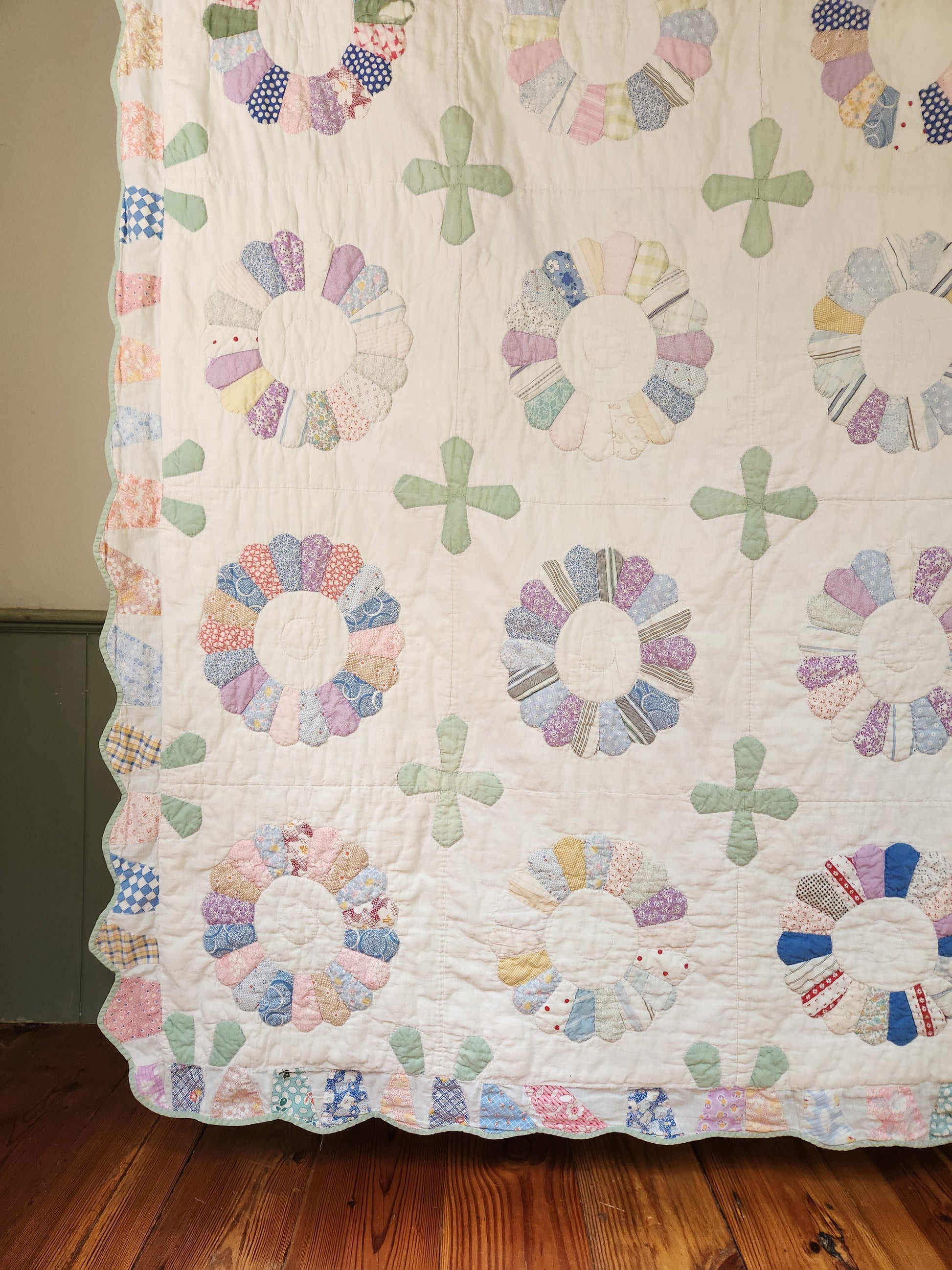 A hand stitched applique quilt circa 1930 to 1940. It is freshly washed, hand stitched and hand quilted. The border is a scallop and, along with the dresden plates, boast a mix of dress prints. At the intersection of each block is stitched a pale green cross.