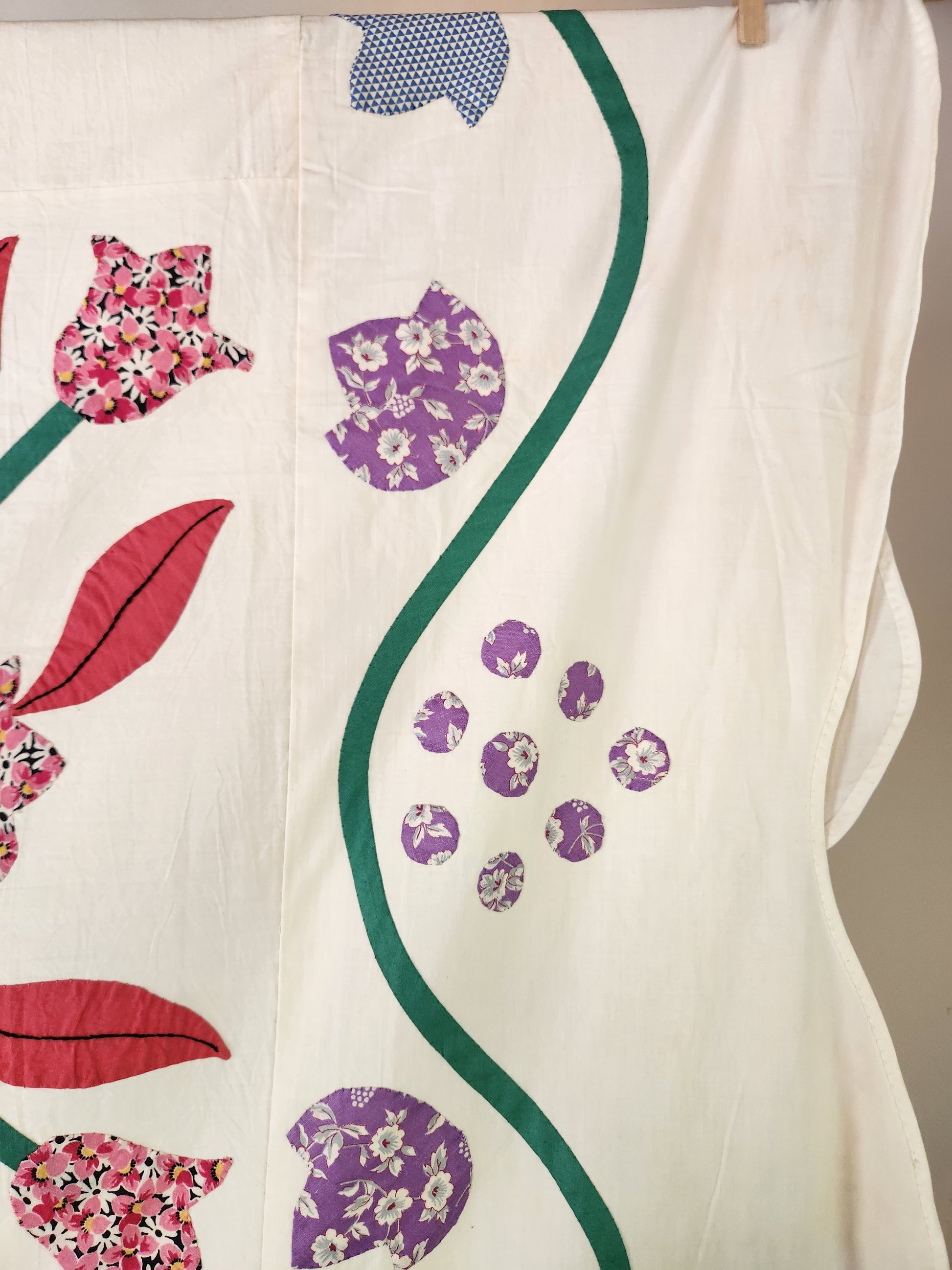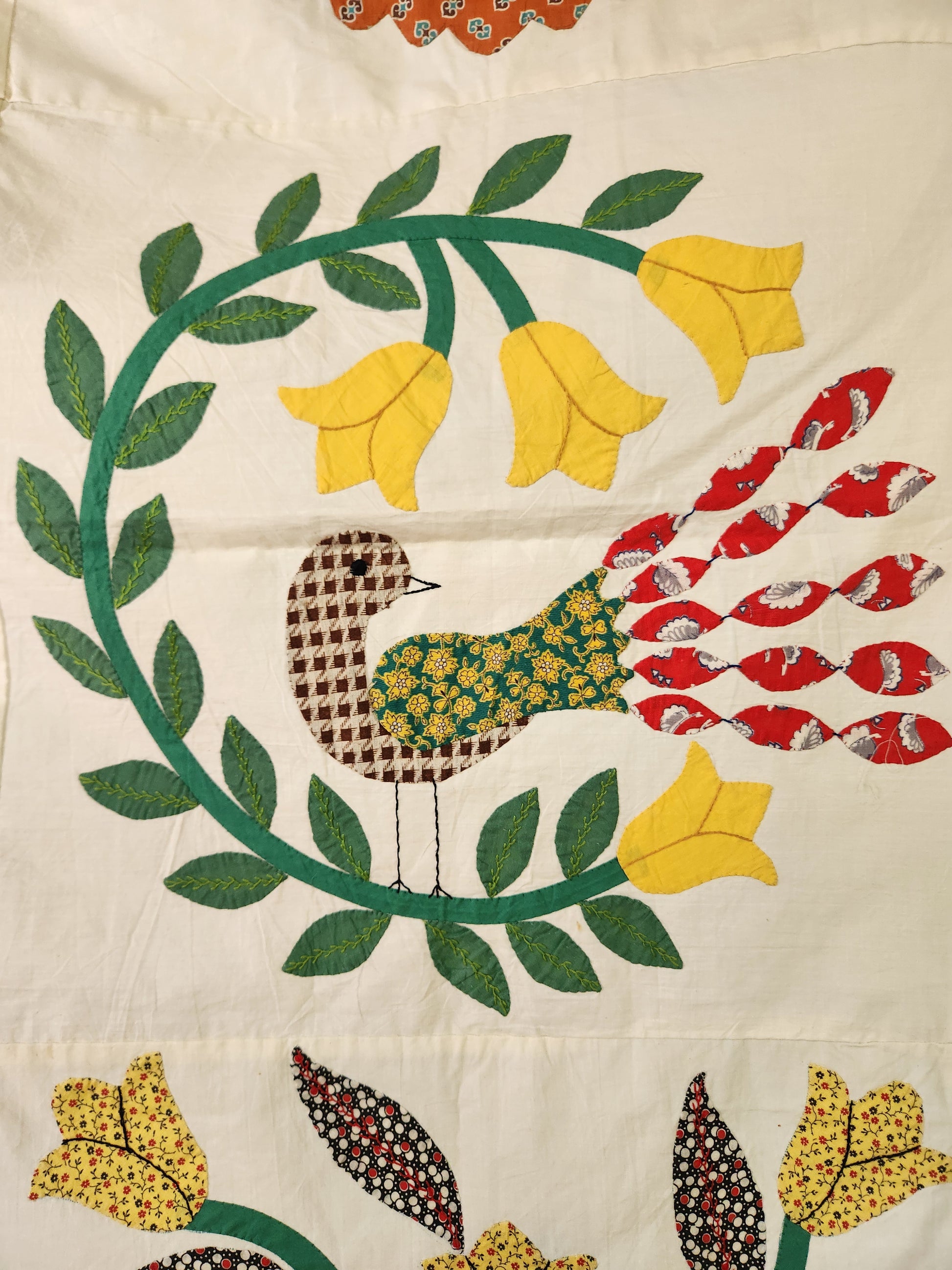 This hand stitched coverlet, possibly a kit, from the mid 1900s is beautifully made. It is one of two, a sort of pair, being offered. It has been carefully stored, and recently aired and pressed. The colors are vibrant and bold. It lies beautifully flat and the large size lends itself well to a bigger bed. The edges are finished.