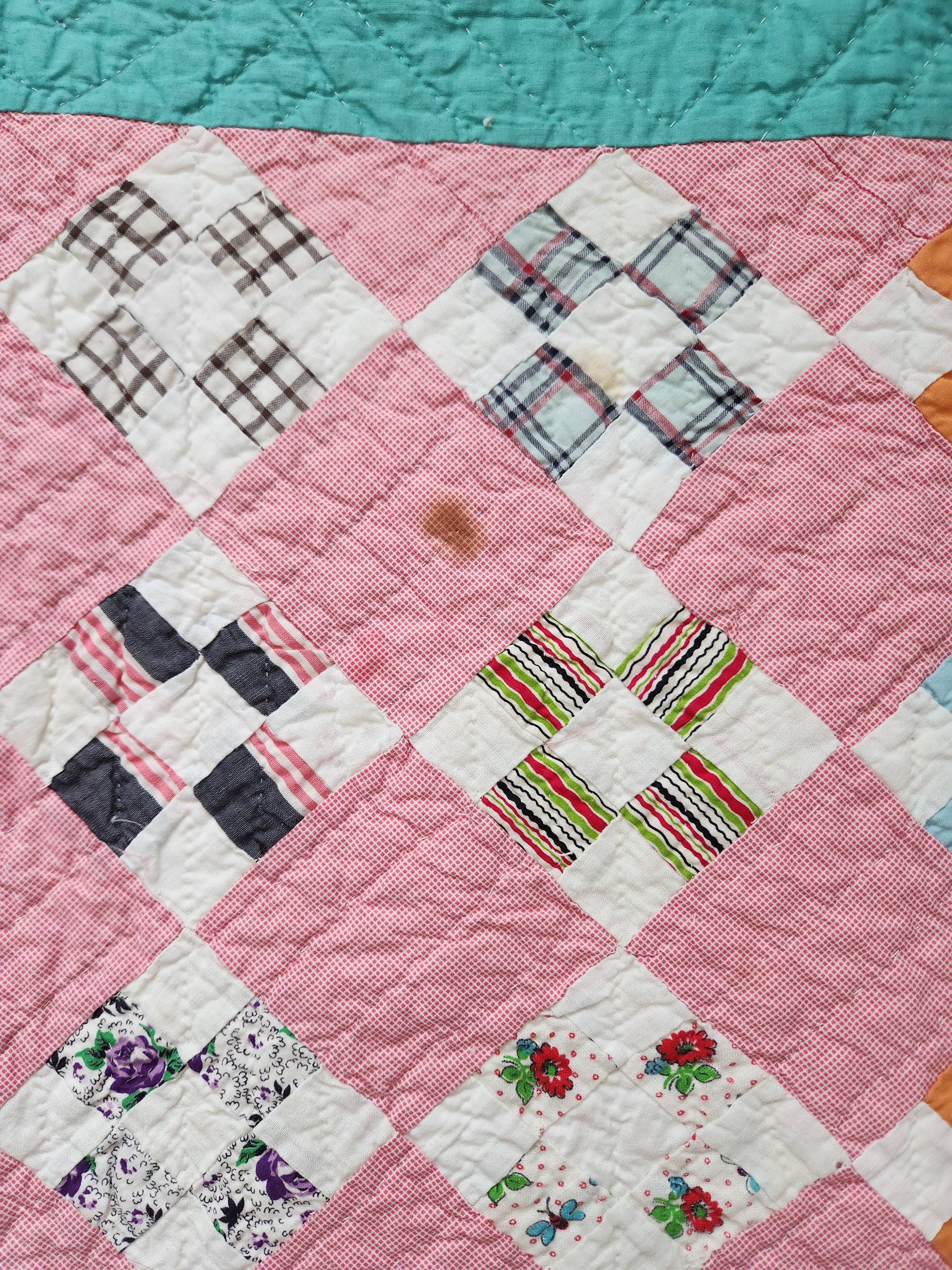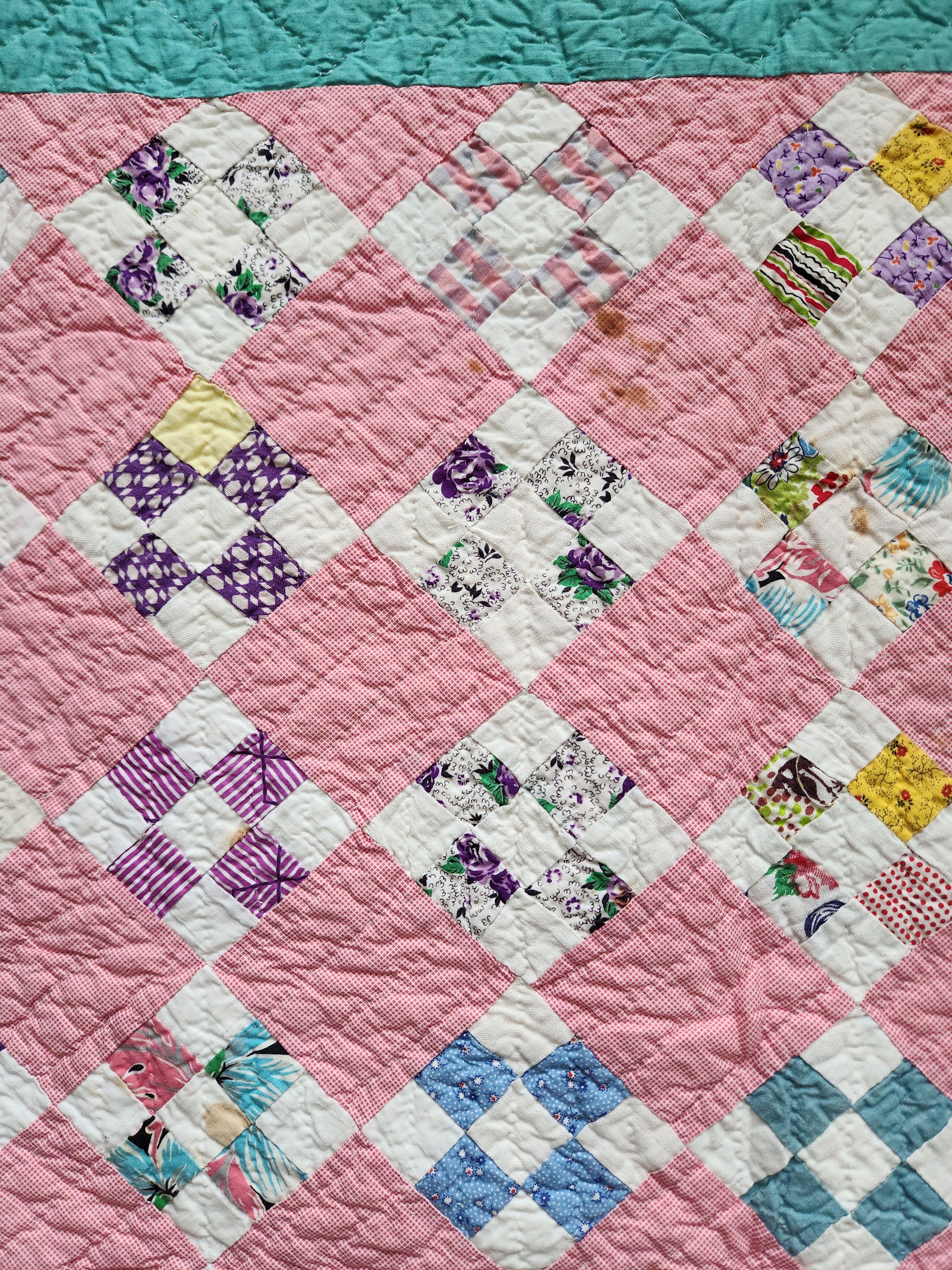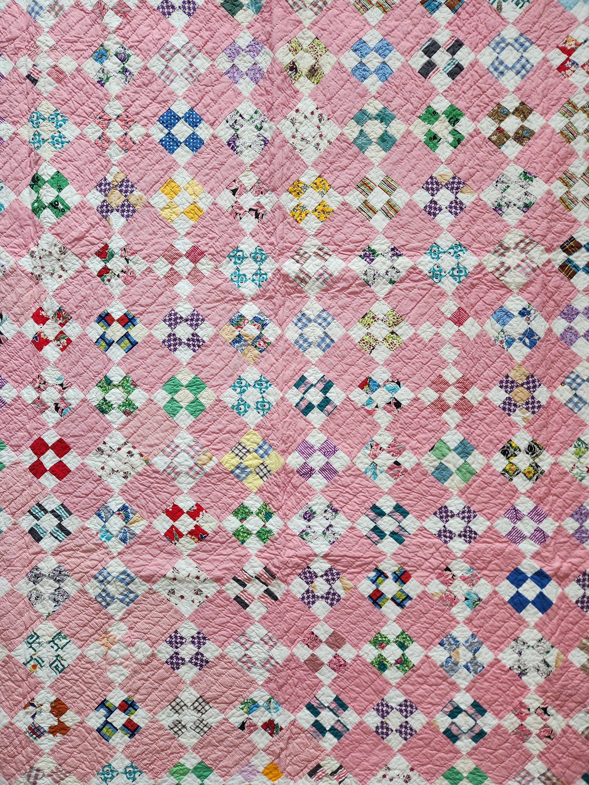 With provenance, this vintage quilt from the mid 1900s is pieced by hand, set by hand and hand quilted on the diagonal. The nine patch blocks measure 3.5 x 3.5” each and are set on point. It boasts a variety of prints in the patchwork and a soft classic pink setting.