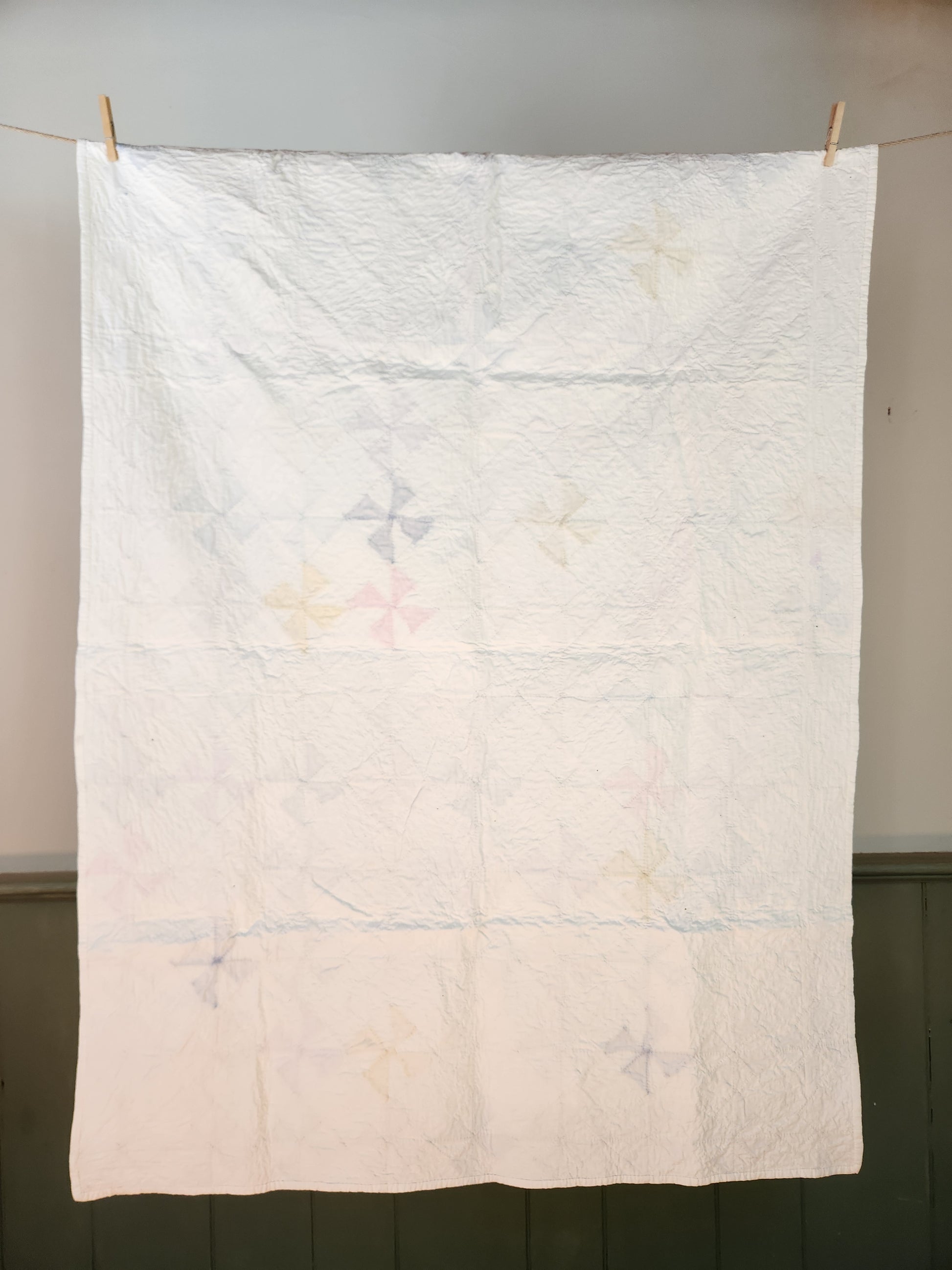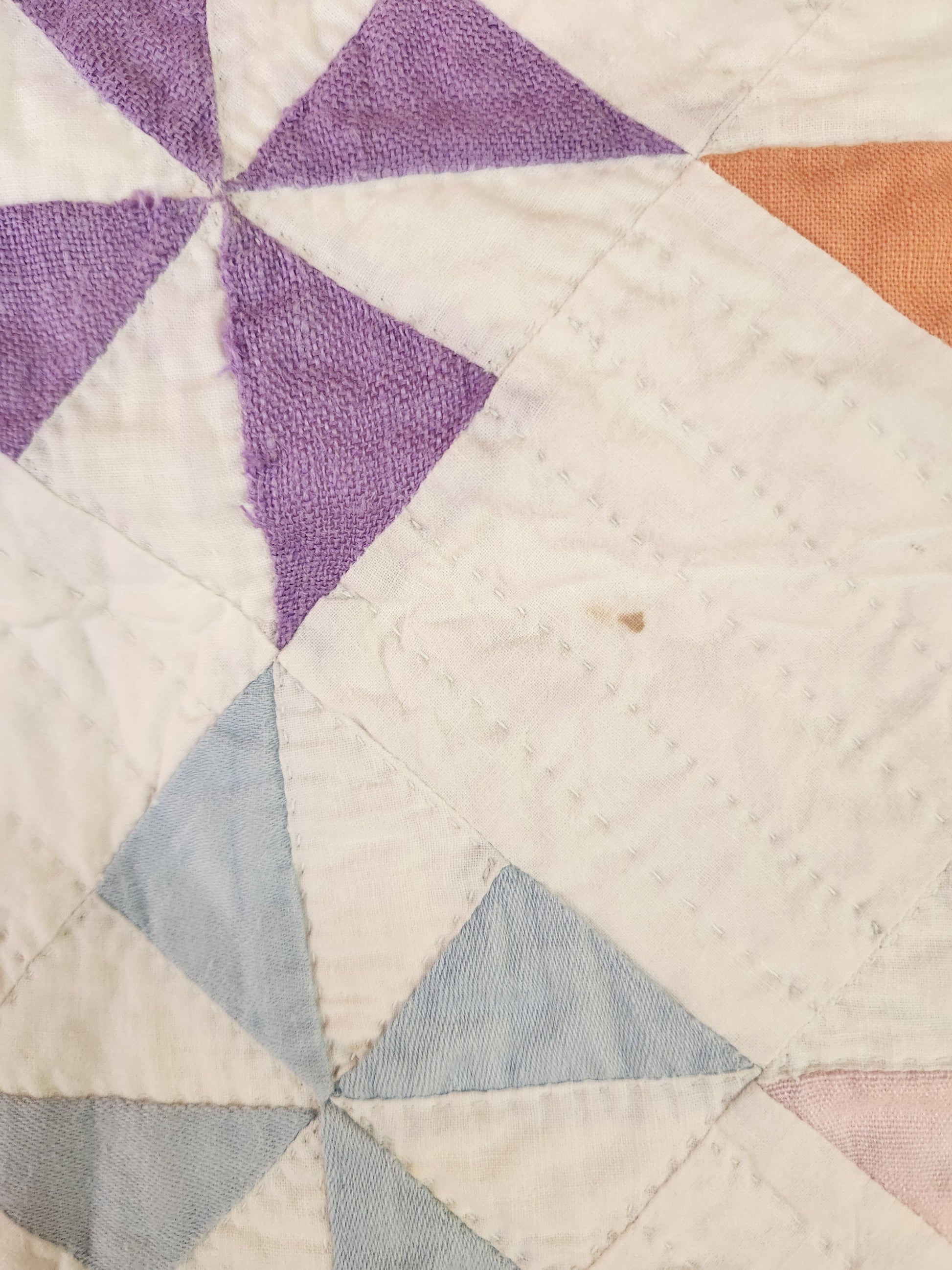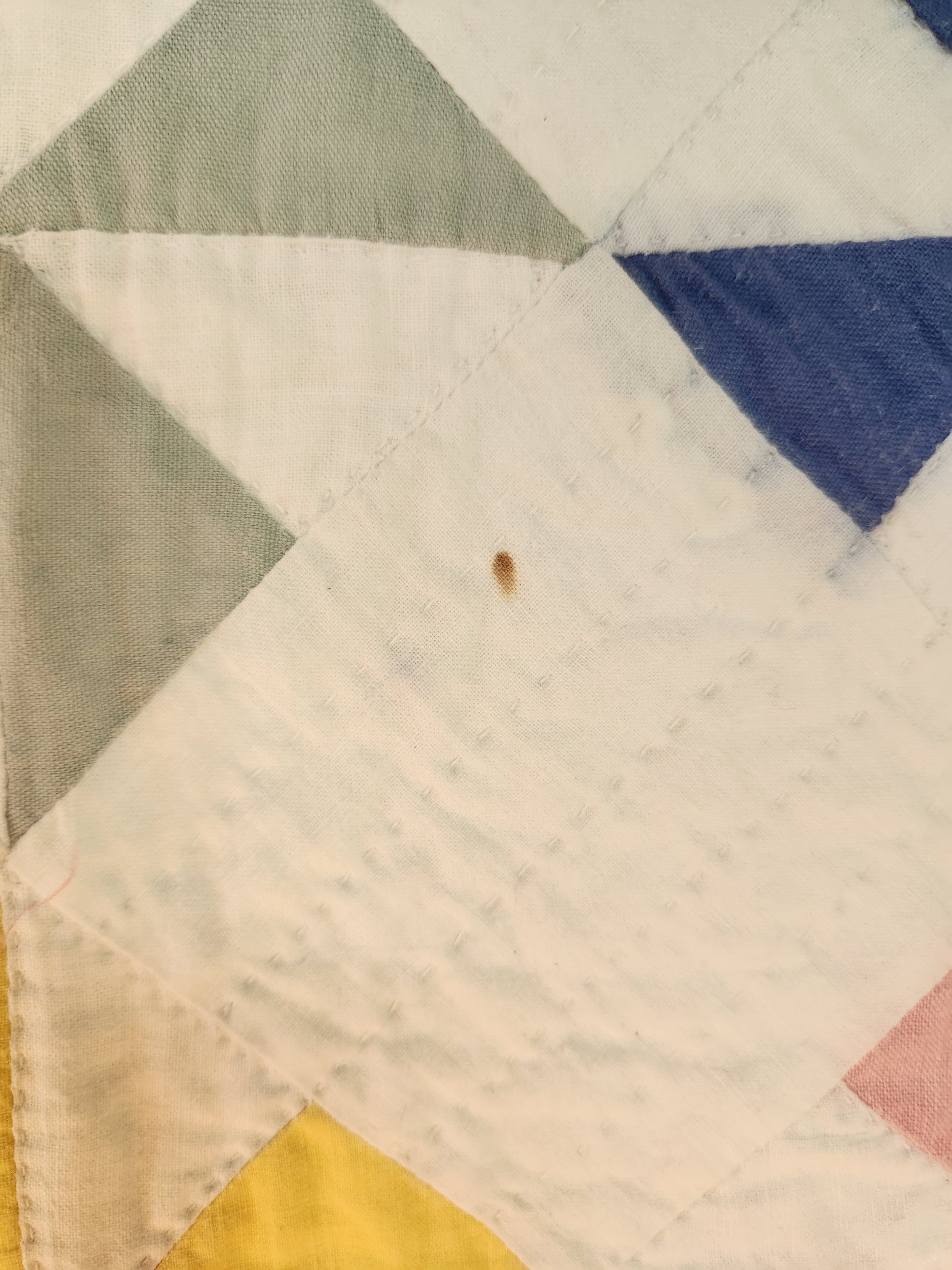 Condition: Good. There are a few pinprick marks, the most significant flaw being dye bleed from the darker yellow pinwheels and one corner blue pinwheel.