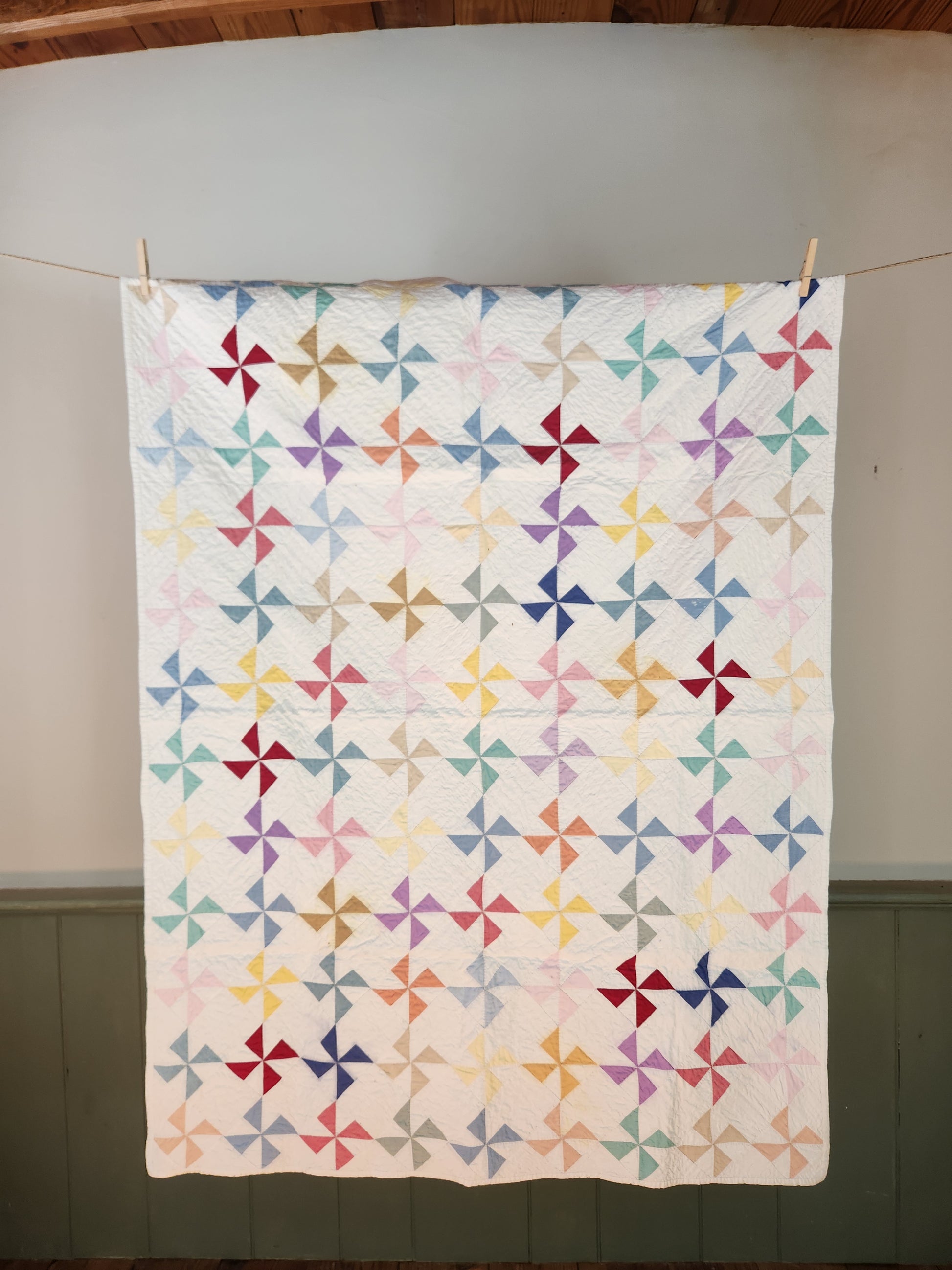 A darling, cheerful little crib sized quilt. Bright and clean, in a rainbow of color pinwheels. This quilt is machine pieced and hand quilted. The white cotton is a beautiful weight, sturdy with a tight weave.