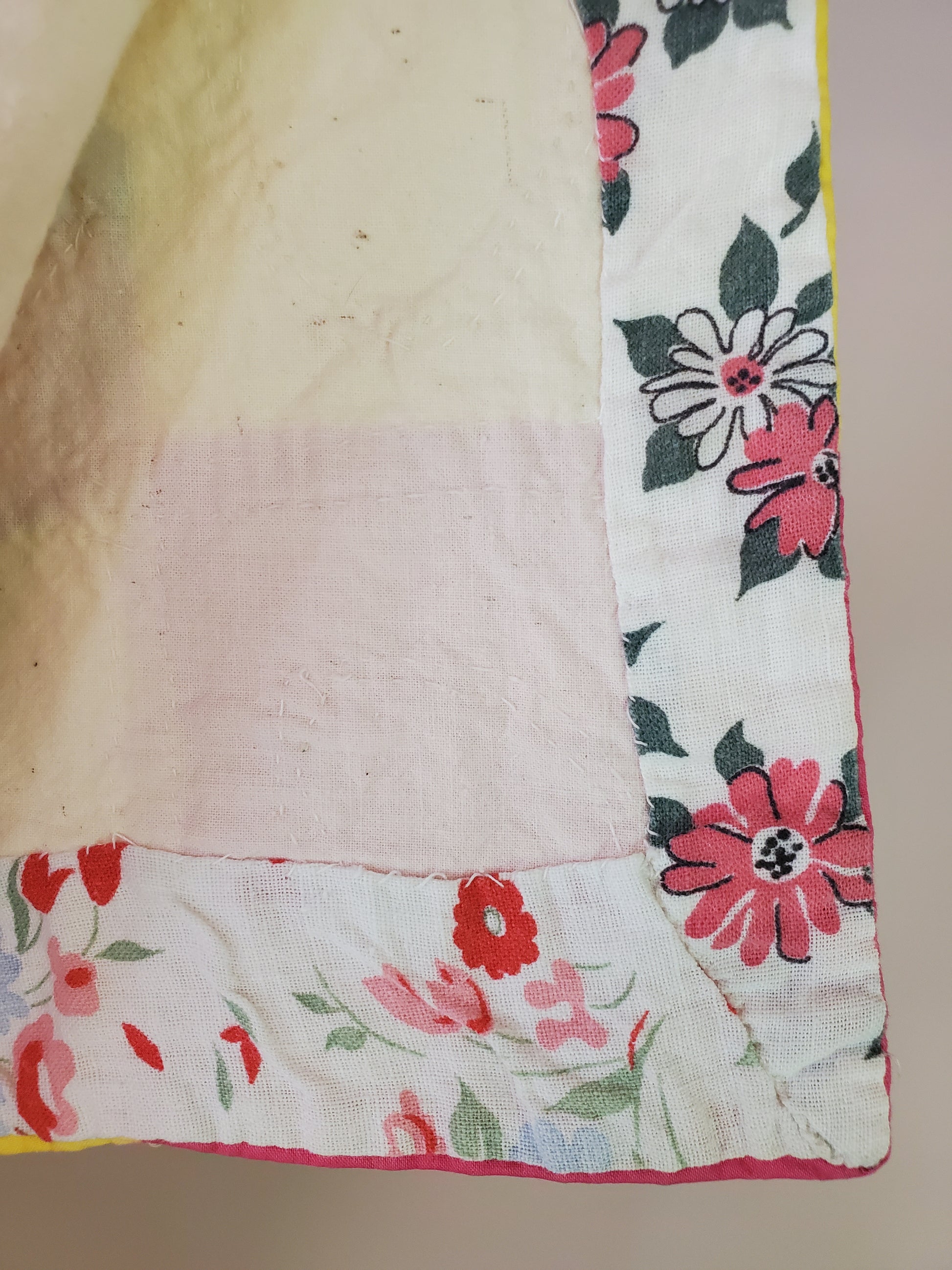 A gorgeous, handmade quilted coverlet from the mid 1900s. This has no batting, it is a thin, summer weight and has a sweetly finished knife edge binding with feed sack backing.