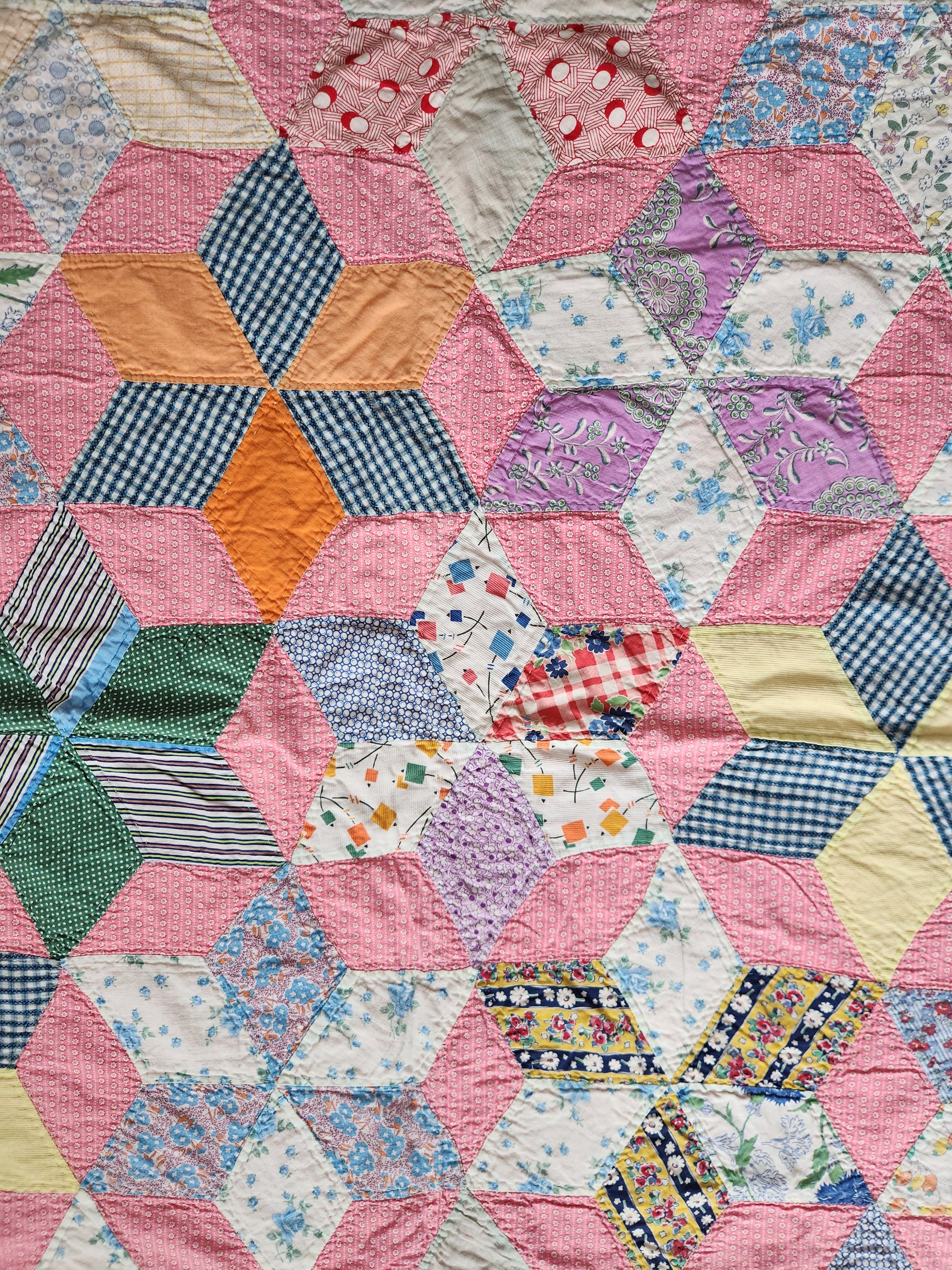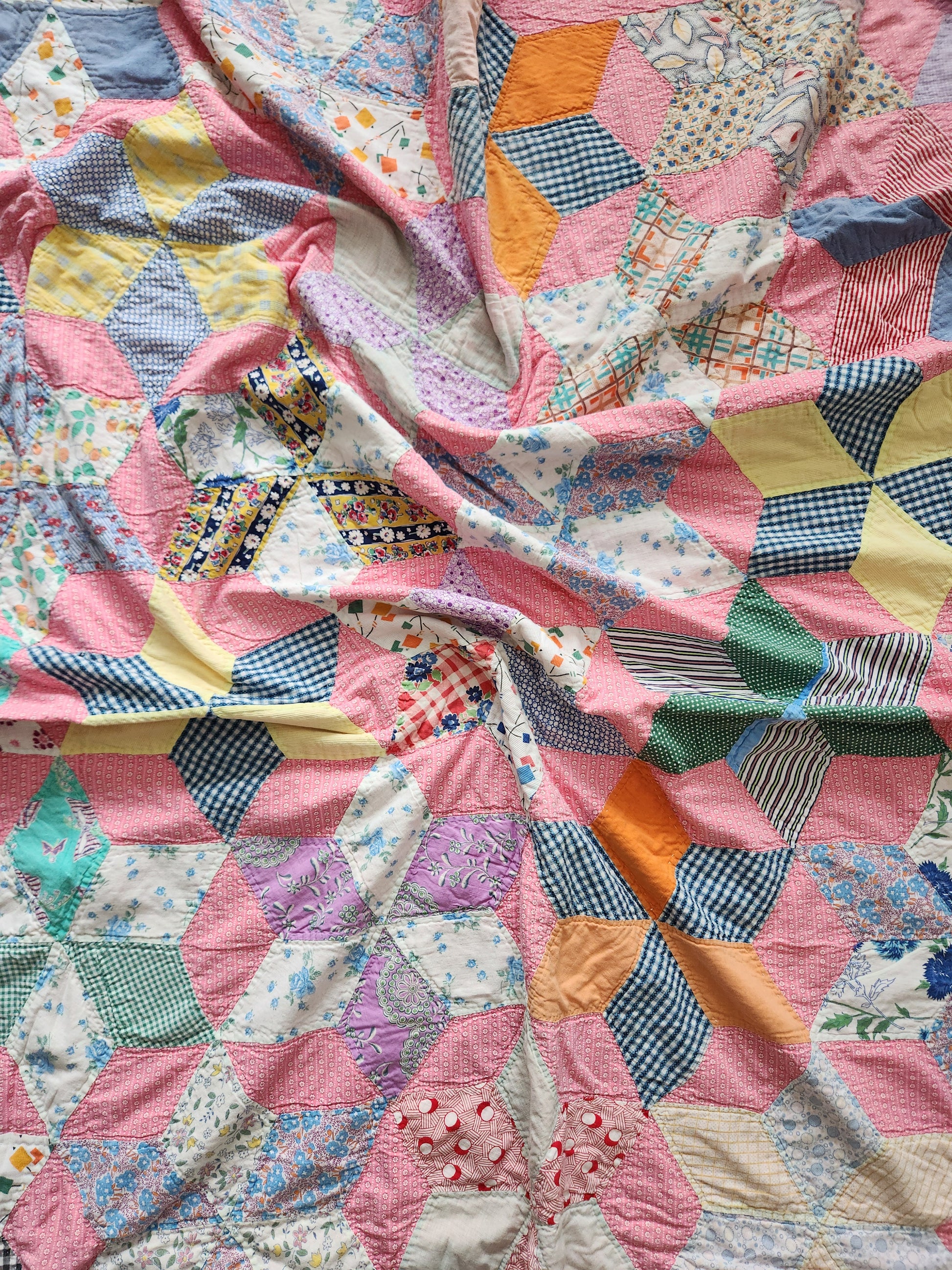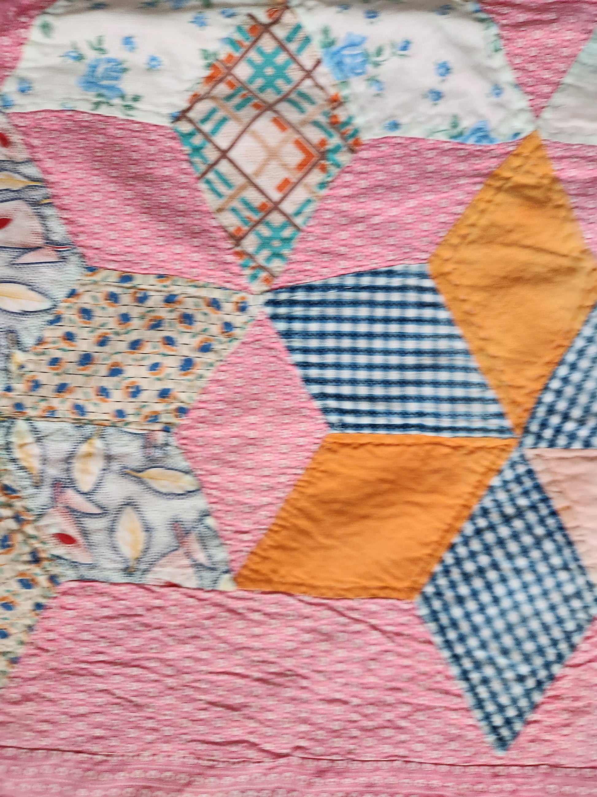 A sweet little quilt in oversized, 6 point stars. Pieced by hand and hand quilted in the main body. The top and bottom edges have a border section with machine quilting. It has an applied binding of pink and white polka dots and a soft white (feed sack) backing. Many different fabrics used for the stars including feed sack cloth, shirting, wovens and solids.