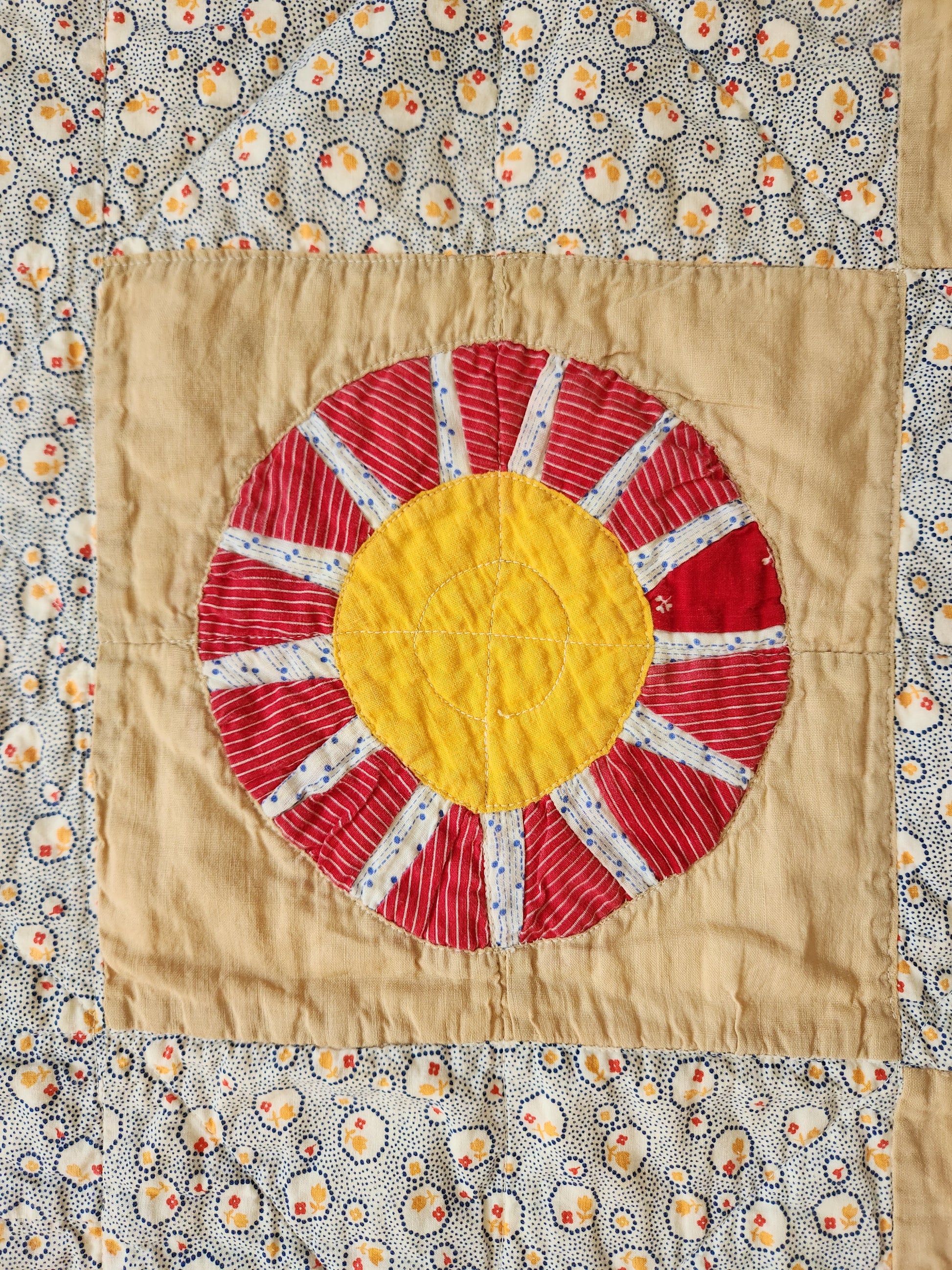 A fabulous handmade quilt from the very early 1900s. The design is whimsical with a fun scrappiness to the wheel blocks that contrasts beautifully with the sweet floral print throughout. This quilt is machine pieced and machine quilted. It is soft, drapey and displays beautifully. A unique piece that makes a great addition to a collection.