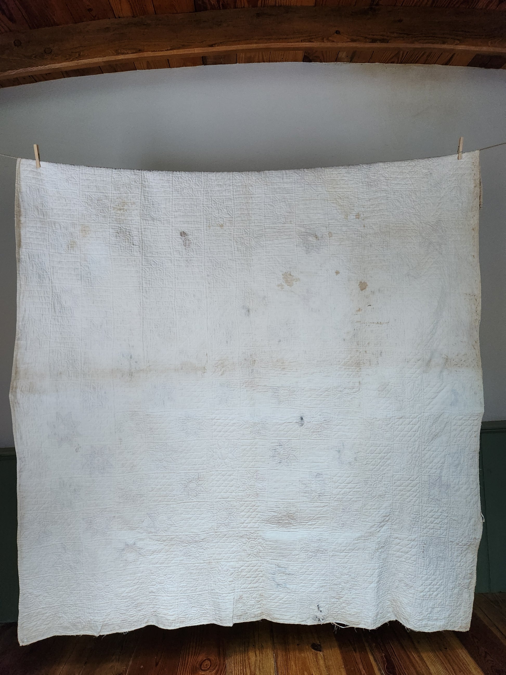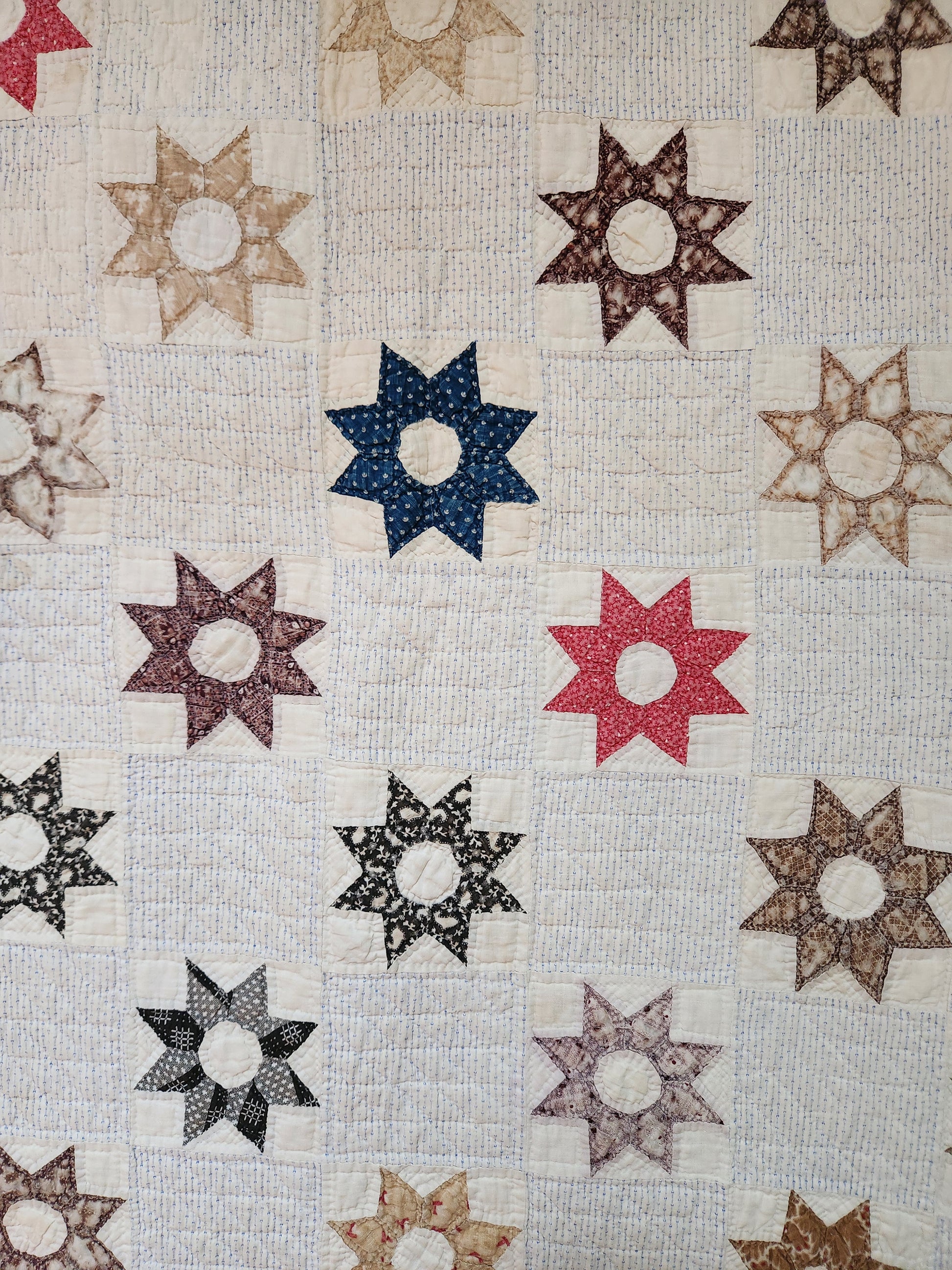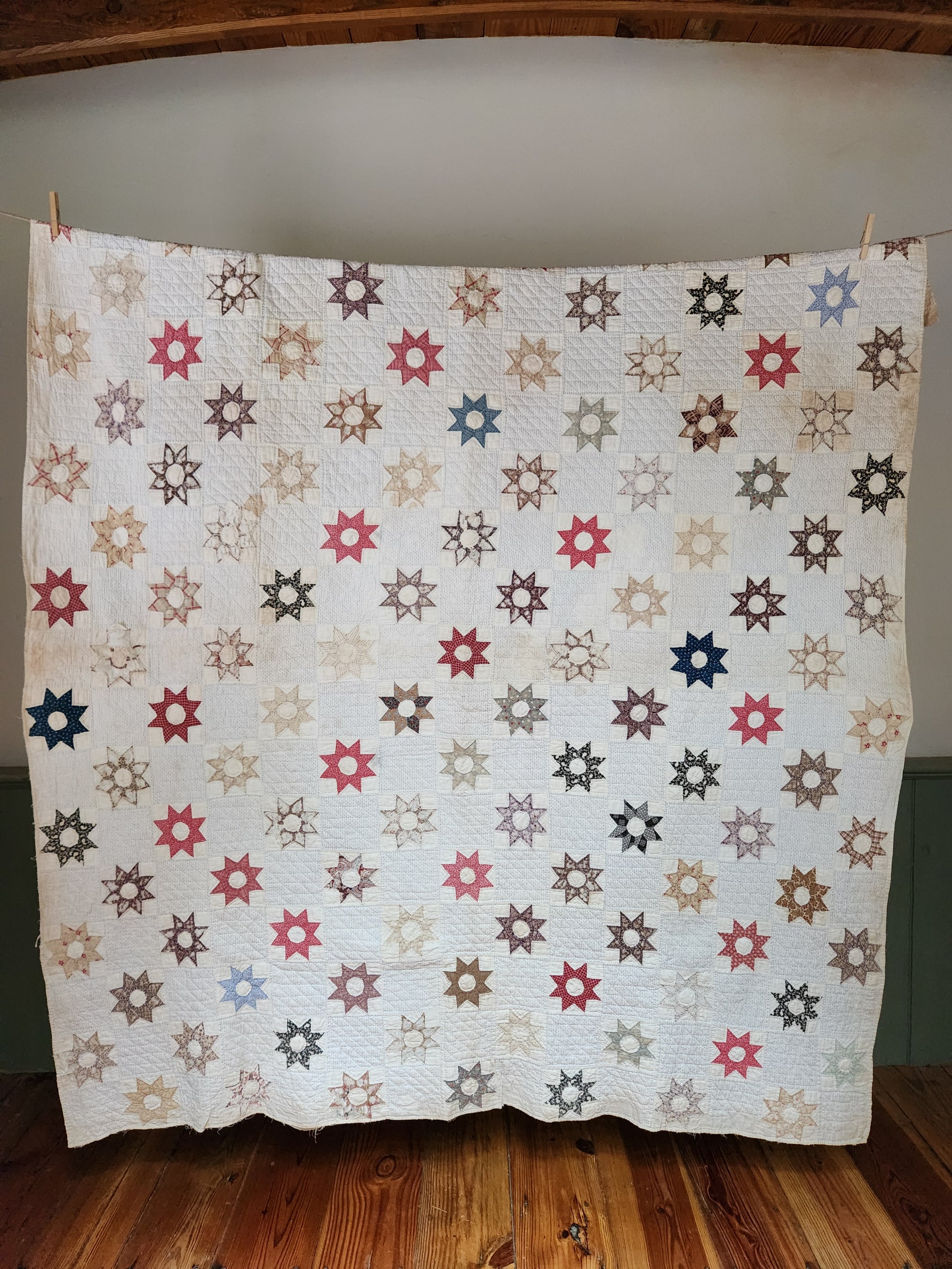 Condition: Lots of wear and tear. There are stars with fabric loss and the edges of the quilt are worn and threadbare from years of use. There is thinning and toning to the fold lines as well. Yellowing in several areas. It has been aired and sunned to refresh.