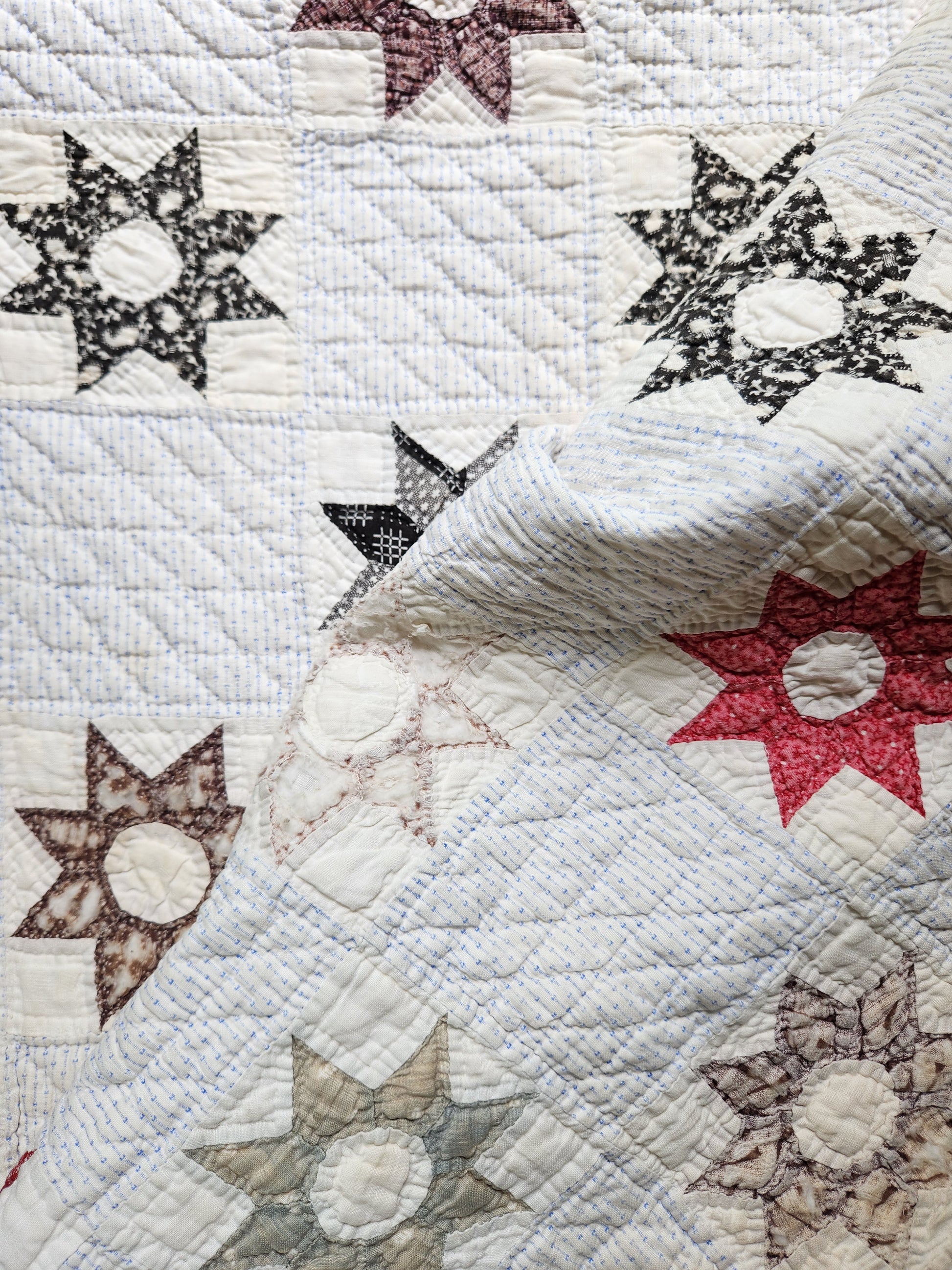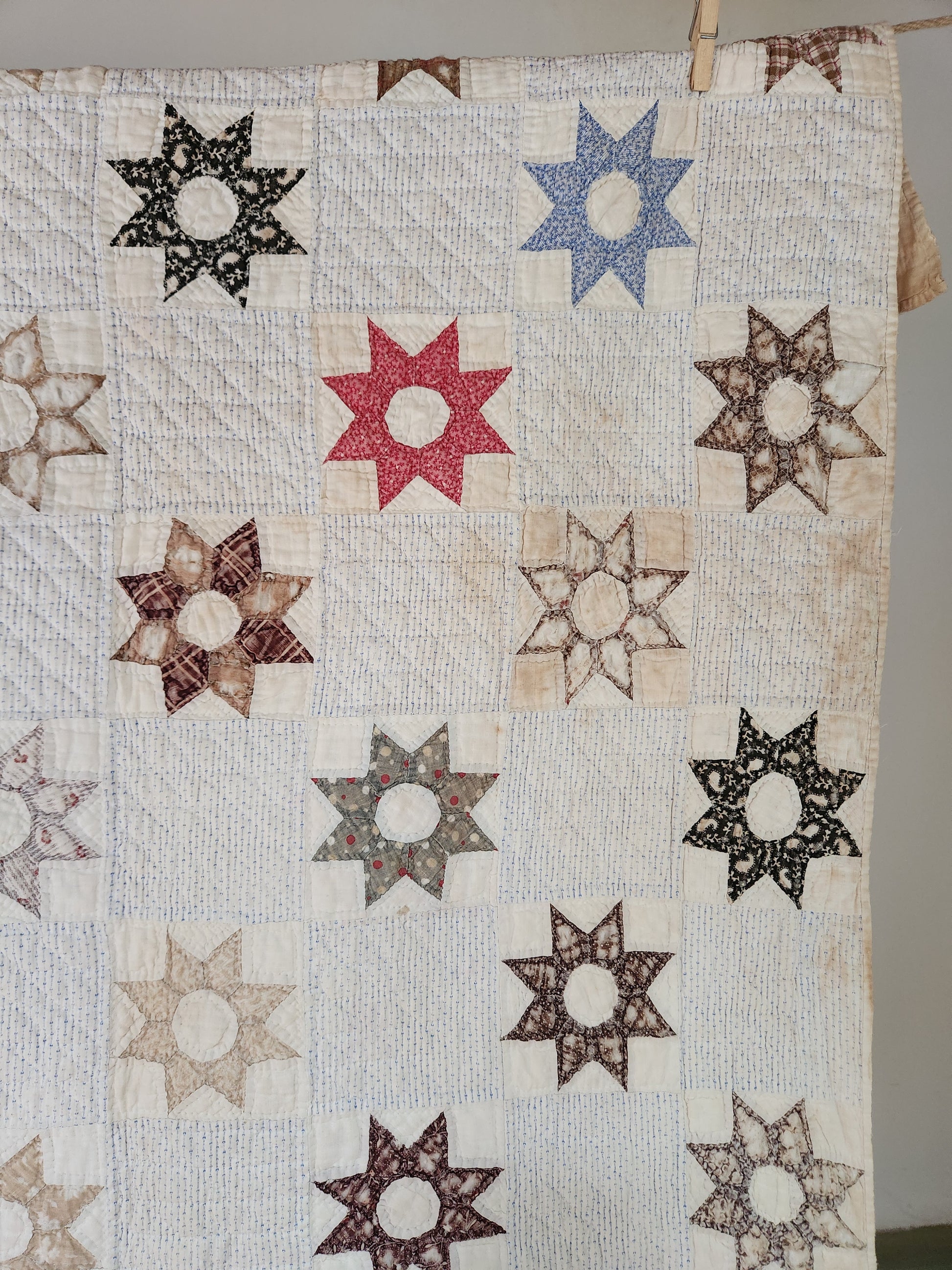 A sweet, patchwork star quilt with much evidence of use and love. The colors are soft and pale with some pops of blue here and there. It is hand pieced and hand quilted.